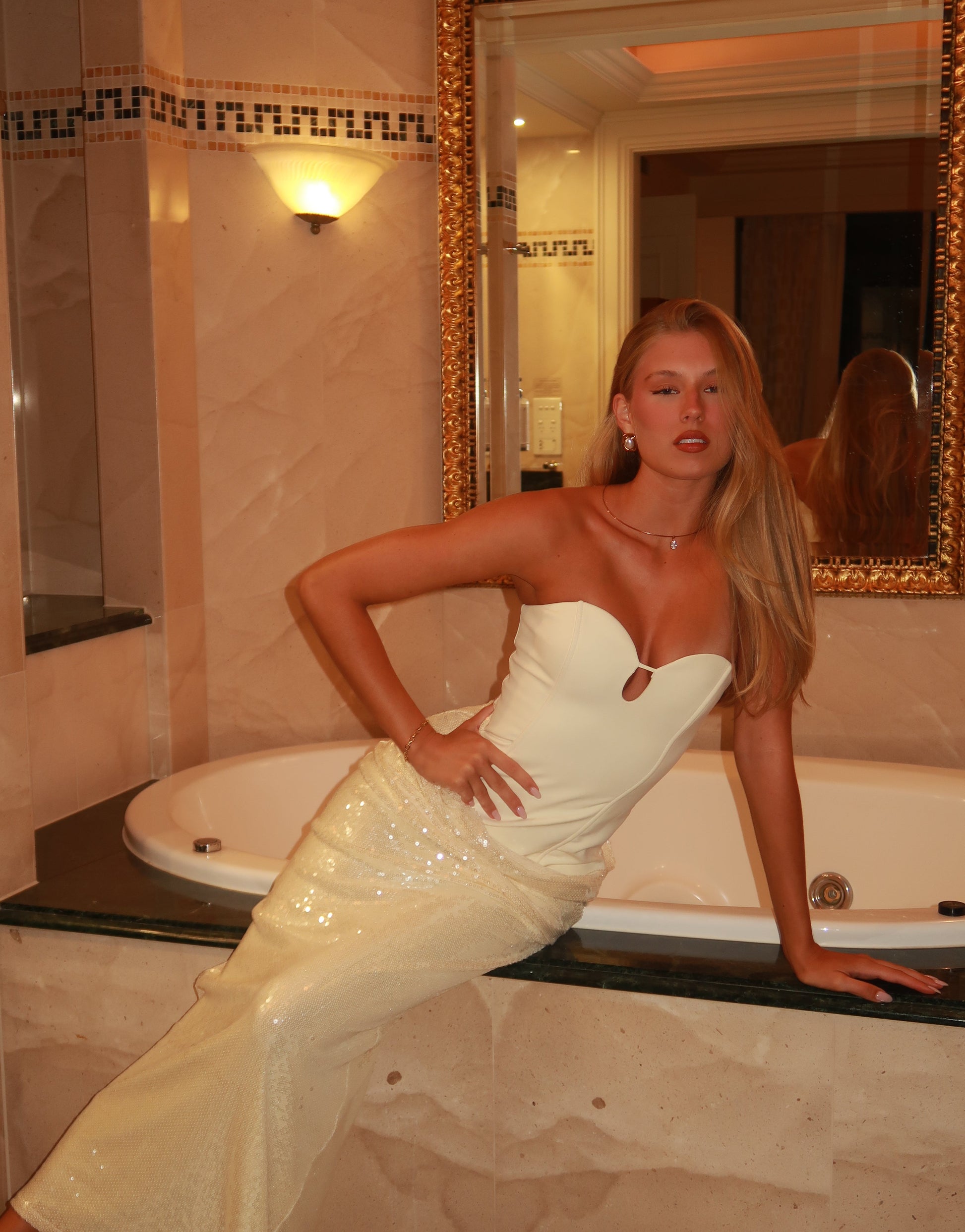 Featuring a structured Ivory bodice with a sweetheart neckline, delicate keyhole cut-out, and a draped sequin skirt that captures the light with every movement. Created to celebrate life’s most memorable occasions.
